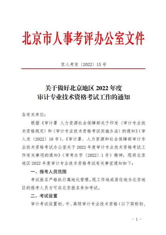 根据《审计署人力资源社会保障部关于印发〈审计专业技术资格规定〉和〈审计专业技术资格考试实施办法〉的通知》(审人发〔2022〕18号)、《审计署、人力资源和社会保障部审计专业技术资格考试办公室关于2022年度审计专业技术资格考试工作有关事项的通知》(审考办字〔2022〕1号)精神,现将北京地区2022年度审计专业技术资格考试有关事宜通知如下: